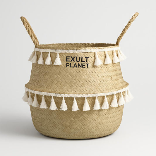 • Eco-Friendly Bohemian Tassel Potted Plant in Natural Woven Basket