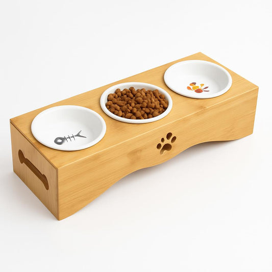 • Eco-Friendly Bamboo Pet Feeding Station with Ceramic Bowls