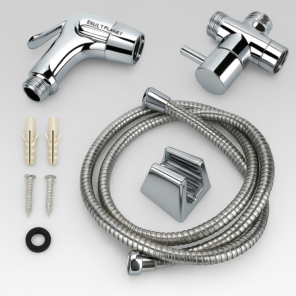 You receive the handheld sprayer, hose, T-valve, mounting bracket, screws, and wall anchors.