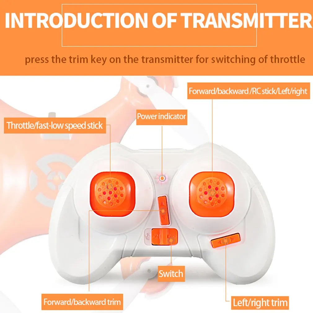 The drone has a built-in 3.7V 100mAh battery. The transmitter needs 2 AAA batteries, not included.